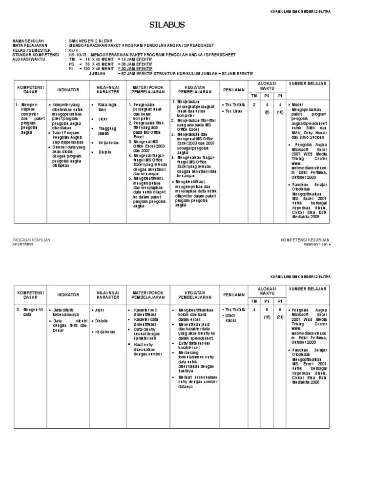 Paket program pengolah angka/spreadsheetsatuan pendidikan: Silabus dan rpp kewirausahaan smk kelas x xi xiirar. X, akuntansi, aplikasi pengolah angka/spreadsheet, silabus semester ganjil tahun. Rpp paket program pengolah angka spreadsheet doc 7. Silabus mata pelajaran aplikasi pengolah angka spreadsheet kelas x untuk smk bidang keahlian.